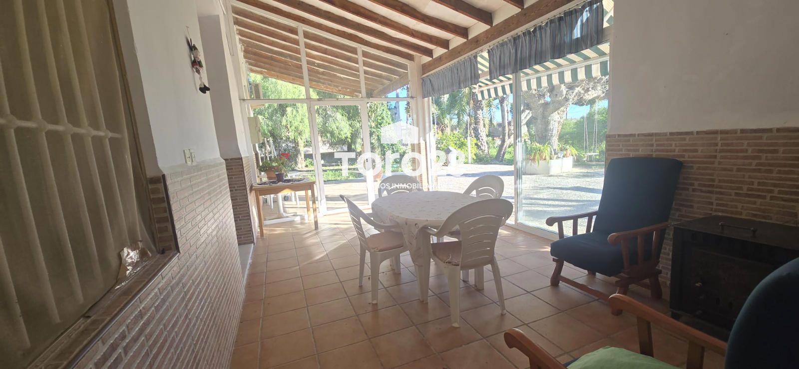 En la parte fontal de la casa se encuentra el  porche de 40 m2. acristalado con estufa de leña y aparato de split de aire acondicionado y calor, con su toldo extensible para proteger del sol.
